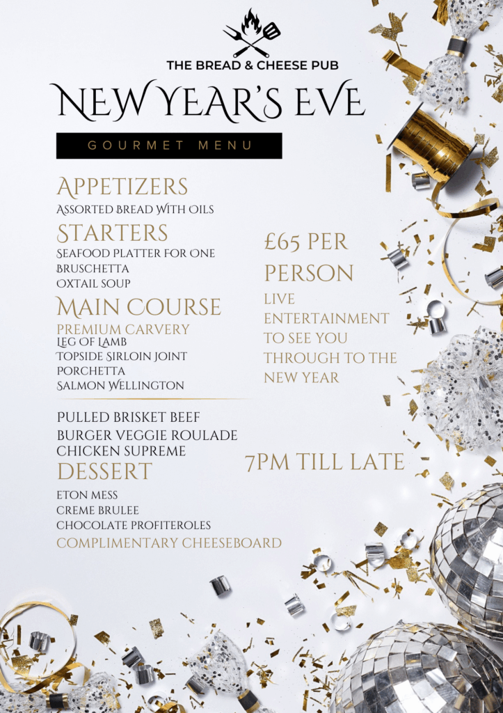 Celebrate New Year’s Eve at The Bread & Cheese with a special four-course menu crafted for the occasion. Enjoy a relaxed, indulgent dinner for £65 per person, then carry the night through with live entertainment as we countdown to midnight. A perfect way to welcome the new year with great food, great company, and a brilliant atmosphere.